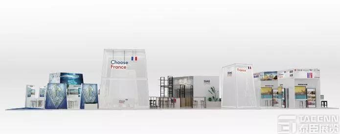 法國展臺的設計理念是通過大量的屏幕和VR互動體驗,將法國館打造成一個充滿互動開放的現代化展臺,使法國方方面面的形象完整地展現給觀眾。展臺主色調為白色,運用不同的地板色調將展臺劃分為展商區、公共區、演講區、品嘗區與互動體驗區。展臺正中間的白色透明塔象征著巴黎鐵塔,也是展臺的公共區,游客可在該區咨詢訪問;左側為展商區,分為4大主題:健康、可持續發展城市、美食美酒以及科技,均可供專業觀眾訪問;后側為品嘗區,可供客人品嘗法國美食美酒,旁邊為演講區,展會期間會舉辦論壇演講;右側為互動體驗區,游客可通過頭戴式VR眼鏡領略法國八個大區的風土人情。